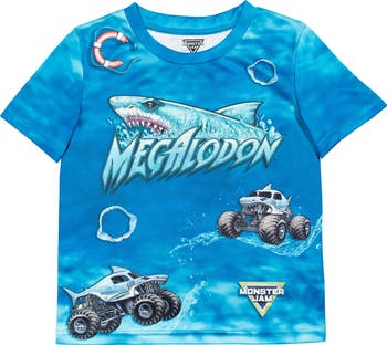 - ["Features officially licensed Monster Jam artwork highlighting fan-favorite trucks like Grave Digger, Megalodon, and El Toro Loco","High-impact, edge-to-edge digital sublimation prints deliver vibrant, fade-resistant graphics that wrap around the entire garment","Lightweight and durable athletic polyester jersey provides a smooth, breathable feel ideal for active play and sports","Designed for all-day comfort with a tagless neck label and taped seams to prevent irritation during movement","Classic crewneck silhouette with a standard fit makes this tee a standout choice for school, playdates, or live motorsport events"]