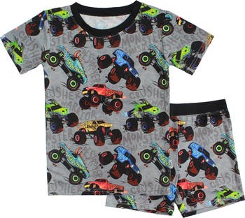 Buttery soft, magic stretch viscose pajamas featuring bold monster trucks. Designed for your action-packed little who's ready to smash it up from the streets to the sheets.