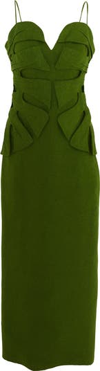 Monstera-leaf appliqués add sculptural elegance at the bodice of this resort-ready dress made from pure linen.
