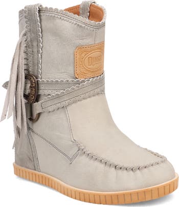 Cascading strands of suede fringe and puckered topstitching along the toe highlight the Southwestern inspiration of this rich leather boot fitted with a cushioned insole.