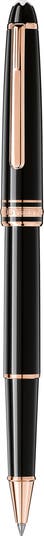 This distinctive pen is encased in striking matte-black resin with gold-coated accents and a signature star emblem. The rollerball tip distributes the ink evenly as it is pressed on the writing surface.