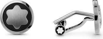 A tasteful snowcap brand design elevates smart cuff links fashioned from sleek stainless steel with an onyx inlay.