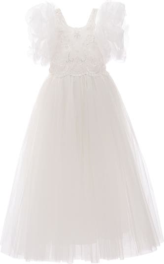 - 100% Polyester?Sleeveless bodice with floral embroidery?Sheer puffed sleeves with soft volume?Pearl-like embellishments for ornate texture?Layered tulle skirt with full-length drape?Refined silhouette for ceremonial occasions?Imported