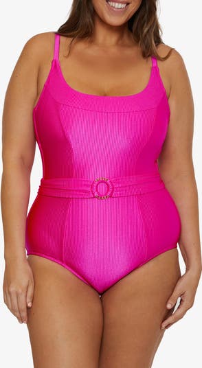 Princess seaming accentuates the natural curves of your body in this knockout swimsuit that stands out from the crowd with its vibrant hue and shimmery, ribbed fabric.