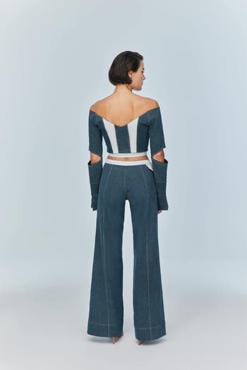 Cut from luxurious contrast-coloured denim, our Monte jacket exudes undeniable charm. This unique, front-buttoned, off-the-shoulder piece offers elegance. It is decorated with decorative side pockets and metallic buttons . The elegant waistline adds a touch of style.