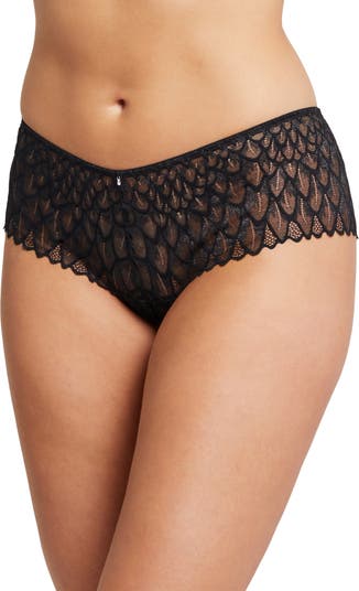 Feather-like lace brings a decadent look to mid-rise Brazilian briefs fashioned with cheeky back coverage.