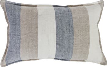 A palette of sunfaded colors in wide coastal stripes is your cue to relax with this pillow made from hearty hand-loomed linen.