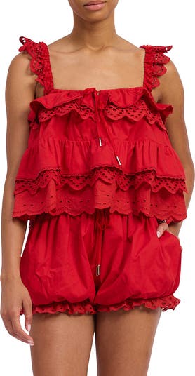 Eyelet embroidery highlights the tiered ruffles of this endlessly charming sleeveless top.
