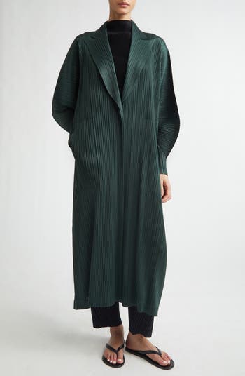 Minimalist by design, maximalist in impact—this one-button coat is designed with Issey Miyake’s signature pleats for a tactile, travel-ready silhouette that remains impeccably crisp, no matter where the day leads.