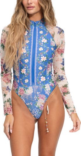 Sporty functionality combines with delicate mixed blooms on this bold one-piece swimsuit designed with a front zip closure, cheeky back coverage and long sleeves cut from sheer mesh.
