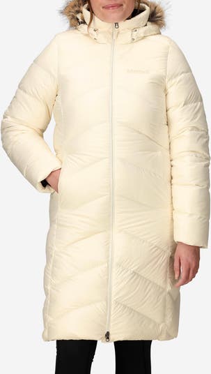 Serious warmth for dealing with serious wintry weather, this hooded down coat is constructed from chevron-quilted recycled polyester and is insulated with 700-fill-power down, even in the hood, which is trimmed in plush, removable faux fur.