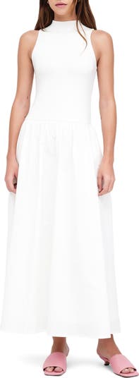 A bodice made from double-layered jersey leads to a full cotton-poplin skirt on this sophisticated funnel-neck dress.
