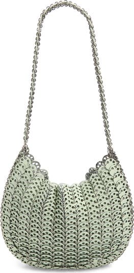 A soft green hue brings a colorful update to this compact iconic shoulder bag composed of layers of shining discs secured by ring hardware.