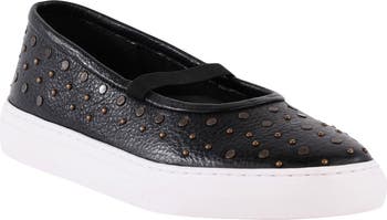 An elasticized mary jane strap offers a secure fit on a pebbled-leather flat that will complement your polished looks.