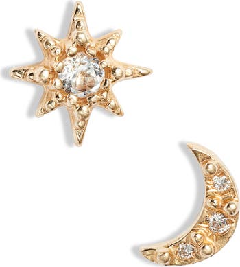 A starburst earring set with a checkerboard-cut clear topaz is perfectly paired with a diamond-embedded moon in these 14-karat-gold studs.