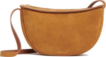 Rounded edges shape the distinct crescent silhouette of this sleek sling bag rendered in rich caramel suede.