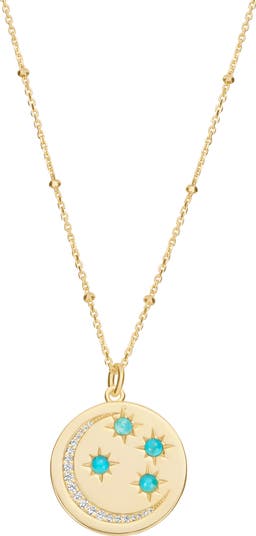 Turquoise stars and a pavé cubic zirconia crescent moon bring celestial beauty to this sterling silver medallion necklace plated in warm 14-karat gold.
