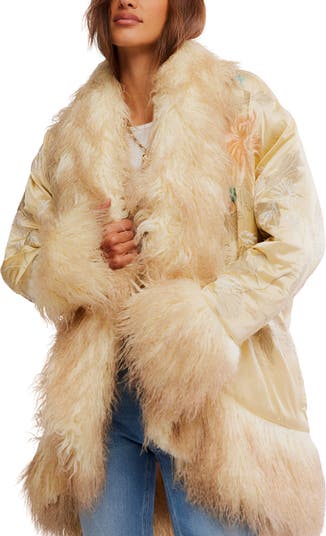 Present your rock-and-roll bona fides in a showstopping coat textured in plush blooms and trimmed in showy faux fur.