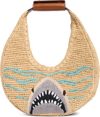 STAUD's iconic bag in a '70s-inspired circular silhouette that resembles a crescent moon is updated for the sunny season in crocheted raffia. The elongated cutout accentuates the lunar shape while providing comfortable shoulder carry.