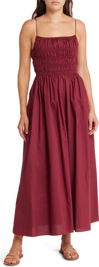 This elegant square-neck midi is designed with a smocked bodice and a drapey gathered skirt.