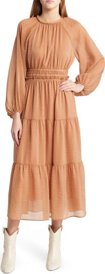 Waistline smocking shapes this flowy metallic maxi that endlessly charms from day to night.