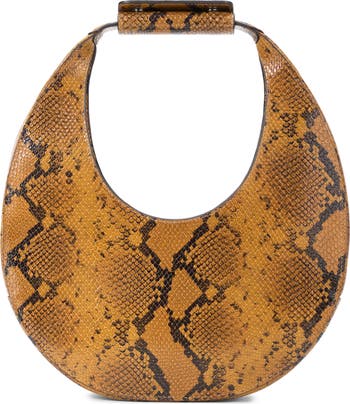 STAUD's iconic tote shaped from snakeskin-embossed leather features a '70s-inspired circular shape that resembles a crescent moon. A structured profile and spacious interior provide easy storage.