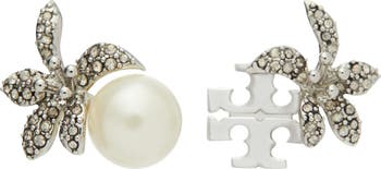 Pretty glass crystals, a faux pearl and the brand's signature interlocking 'T' logo define a pair of stud earrings that add instant glamour to your lobes.