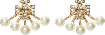 Glowing faux pearls shine on these stunning front/back earrings featuring sparkling pavé double-T logo detailing.