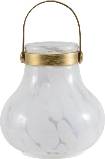 Bring timeless style and modern functionality to any space with the Moondrop Lantern. Designed for today’s lifestyle, this handblown glass lantern features a sleek rounded shape accented with brushed brass details and a sturdy metal handle. Its versatile, weather-resistant design makes it the perfect portable light for both indoor and outdoor use—from bedside tables and desks to picnics, patios, boats or alfresco dinners. The Moondrop Lantern is equipped with long-lasting warm white LEDs and a 3-level dimmable light function to create the perfect ambiance. A built-in rechargeable battery powers the lantern for 8–12 hours on a full charge, ensuring effortless illumination well into the evening. Features: Handblown glass with weather-resistant construction for indoor & outdoor lighting Rechargeable battery provides 8–12 hours of glow per charge 3-phase dimmable warm white LED lighting Elegant brushed brass accents with a stylish metal handle Compact size: 5.7 in. x 5.3 in. Includes 5.5 ft. indoor charging cord & wall charger The Moondrop Lantern combines modern design, portability, and eco-friendly LED lighting, making it an ideal choice for home décor, outdoor entertaining, or on-the-go adventures.