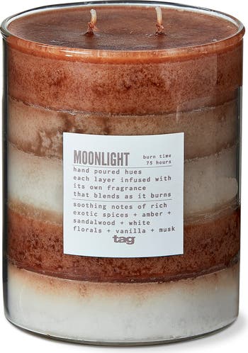 - The Frag Fusion Moonlight Wide Flame Scented Pillar Candle is made of white paraffin wax, has a burn time of 75 hours, weighs 26.7 ounces, and measures 4.9 inches in height and 3.9 inches in diameter.