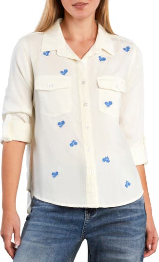 Embroidered lilies drift down this laid-back, summery shirt equipped with button-flap pockets and roll-tab cuffs for a bit of utility style.