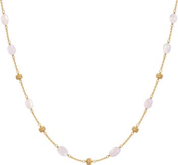 Illuminate your style with the Moonlit Radiance Moonstone Necklace. Smooth, flat Rainbow Moonstone beads shimmer with a soft, ethereal glow, complemented by delicate white accent stones that catch the light with subtle brilliance. Crafted from lustrous 18K Gold-Plated Silver & Brass, this necklace blends timeless sophistication with gentle radiance. Handcrafted in Thailand, it is a versatile accessory that adds grace and luminous beauty to any ensemble.