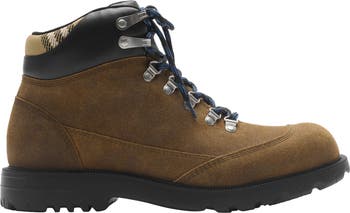 A house-signature Equestrian Knight Design is embroidered in tonal threads at the heel counter of this hiking-inspired suede boot trimmed with the instantly recognizable checks along the collar.