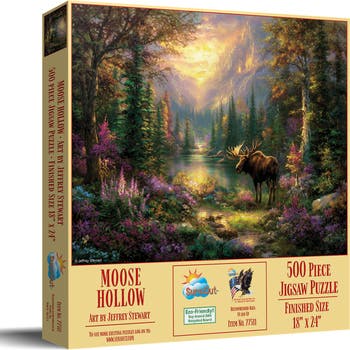 Moose Hollow 500 pc Jigsaw Puzzle by SunsOut - 500 Piece Jigsaw Puzzle - Completed Size: 18" x 24" - Puzzle Artist: Jeffrey Stewart - Interlocking Pieces and Durable Construction: SunsOut jigsaw puzzles feature interlocking pieces that fit securely, making assembly easier and reducing frustration. -Ages: 15 years and older - Perfect for adults and seniors. SunsOut puzzles ensure high manufacturing standards ensuring their commitment to quality and customer service. - SunsOut puzzles use soy based inks, high quality puzzle board. As this is a jigsaw puzzle: assembly is required and batteries are not required.