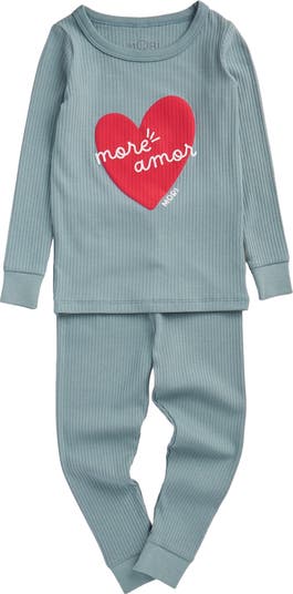 Snuggle up with more love. This ribbed pajama set is made for Valentine’s cuddles, complete with a puff “More Amor” print and soft, stretchy viscose fabric. Easy poppers make dressing a breeze.