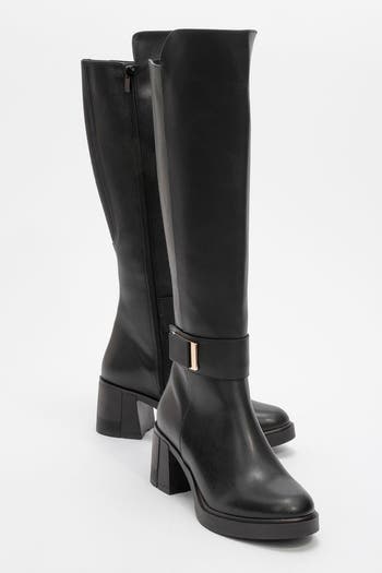 A sleek knee-high boot that balances form and function with stretch-paneled comfort