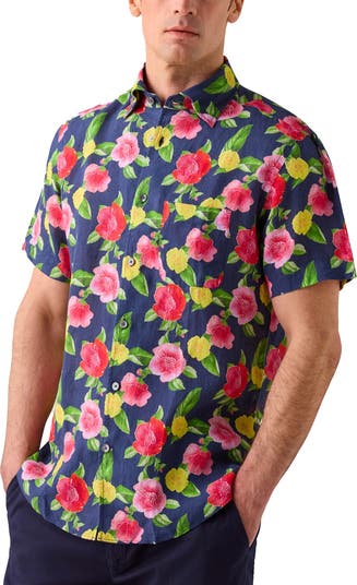 A warm-weather essential made with California luxury in mind. This short sleeve shirt features a floral print throughout, and is cut from 100% linen. Lightweight, breathable, and designed for effortless wear, the Morgan features our signature California One-Piece Collar with a hidden button-down for a relaxed yet polished drape. Thoughtfully finished with Trocas shell buttons, a French placket, and subtle signature details, it blends laid-back ease with refined craftsmanship.