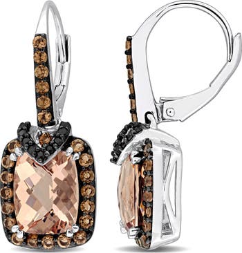 Experience luxurious elegance with these sterling silver leverback earrings, showcasing mesmerizing morganite, smoky quartz, and accented by black diamonds. The soft hues of morganite and smoky quartz harmonize beautifully, enhanced by the contrasting allure of black diamonds, creating a captivating blend of sophistication and mystery. Meticulously crafted for a striking balance of refinement and allure, these earrings stand as a unique statement piece, adding a touch of opulent charm to any ensemble.