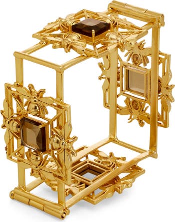 The Mori Square Cuff is handcrafted in 22k gold-plated brass with brown beer quartz glass gems. Detailed with bee motifs, the cuff balances open space with structured elements for a strong visual presence. Finished with an openable clasp, it offers a secure fit and is suitable for daytime occasions, festive settings, and evening events.