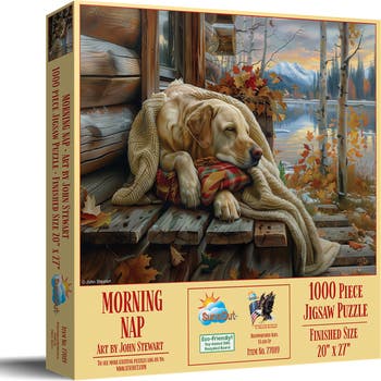 Discover tranquility with the Morning Nap 1000 Piece Jigsaw Puzzle, artfully crafted by John Stewart. Immerse yourself in the serene scene of an autumn morning, featuring a peaceful Labrador that captures the essence of relaxation. SunsOut Puzzles, made in the USA, upholds top-notch manufacturing standards, with precision-cut pieces made from high-quality recycled cardboard, ensuring durability for a captivating and calming puzzle experience. The company's commitment to eco-conscious craftsmanship shines through, utilizing environmentally-friendly soy-based inks and the highest quality recycled-board. In indulging in this pastime, you not only enjoy the challenge but also support a woman-owned small business. SunsOut stands behind its products, providing a worry-free guarantee and ensuring customer satisfaction to maintain your peaceful puzzle time. The Morning Nap puzzle portrays John Stewart's fully licensed artwork, blending Americana, animals, and landscape themes. The large, full-color display box lets its beauty shine from the moment you see it, providing your space an added touch of nature and art. Engage with this jigsaw puzzle as more than just entertainment, but also as a means to enhance concentration and mindfulness. Perfect for adults seeking respite from everyday stress, the Morning Nap puzzle offers a meditative break, sparking creativity and joy in any quiet afternoon.