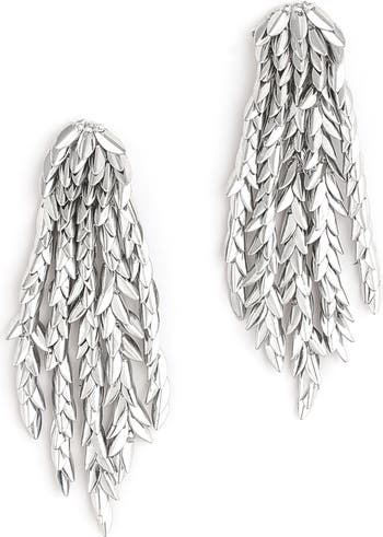 Feathery sculpted petals cascade in loose strands on these shimmering statement earrings finished in a silvery hue.