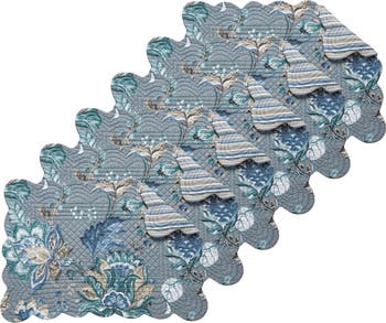 Add comfort and style to any home with the Morrison Damask quilted tabletop collection. This sophisticated damask-floral print reverses to a coordinating stripe pattern in agreeable shades of blue, green, and tan. These table linens feature scalloped-edge placemats for an added touch of style. Love this pattern? Morrison Damask is also available as a bedding collection.