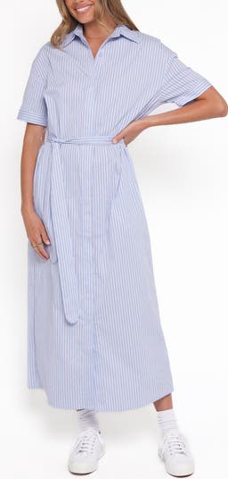 A matching tie snatches the waistline of a cotton-blend shirtdress that has you looking posh from day to night.