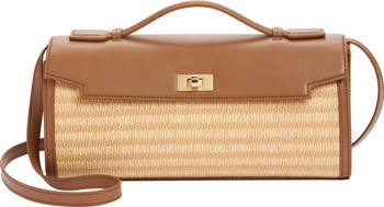 Made from a mix of smooth leather and earthy woven raffia, this polished clutch is designed in a boxy silhouette secured with a logo-etched turnlock, and equipped with a top handle and removable strap for carrying options.