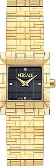 A guilloche dial and mosaic-style bracelet crafted from two-toned stainless steel bring timeless elegance to this Swiss-quartz watch boasting a square case. A Medusa-head motif on the caseback adds a signature finish to the look.