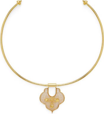 The Mosaic Necklace transforms architectural precision into a sculptural, wearable form. Handcrafted in 22k gold-plated brass, the open-ended hansli (choker) features a central mother-of-pearl resin disc layered with delicate metal relief and backed by an intricate filigree pattern, echoing the geometric artistry of traditional tilework.