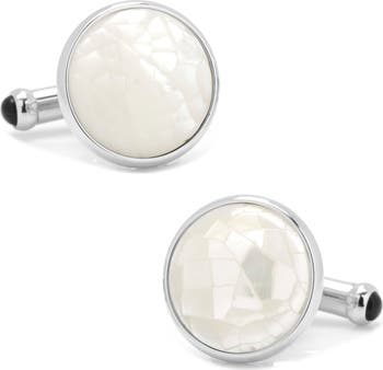 Mosaic-cracked mother-of-pearl inlays illuminate these refined round cuff links set in sterling silver.