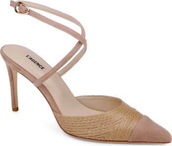 A suede cap toe and woven raffia upper bring textural interplay so a fierce pump lifted by a stiletto heel and secured with a crisscrossing ankle strap. Memory foam cushioning delivers optimal underfoot comfort.