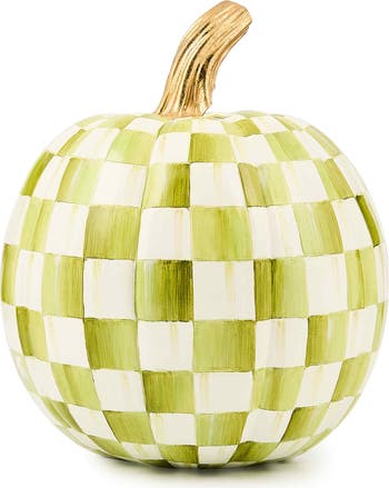 Add a touch of seasonal charm to your holiday decor with this handmade resin pumpkin painted with playful moss checks and trimmed with a gold-leaf stem.