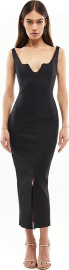 A beautiful classic with a twist. This midi dress will definitely be the star of your wardrobe, with a daring slit at the front and spectacular wave neckline for added drama.